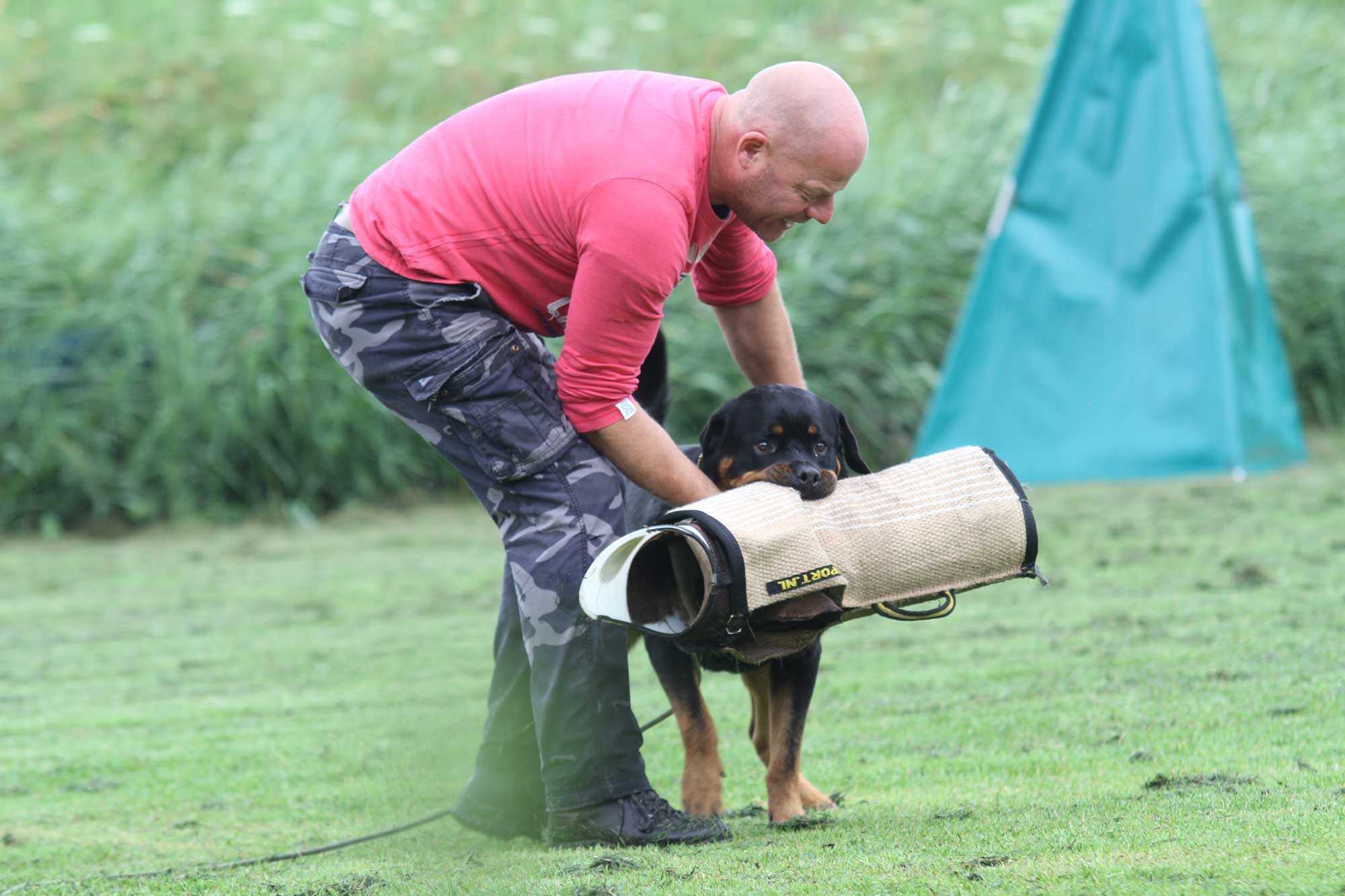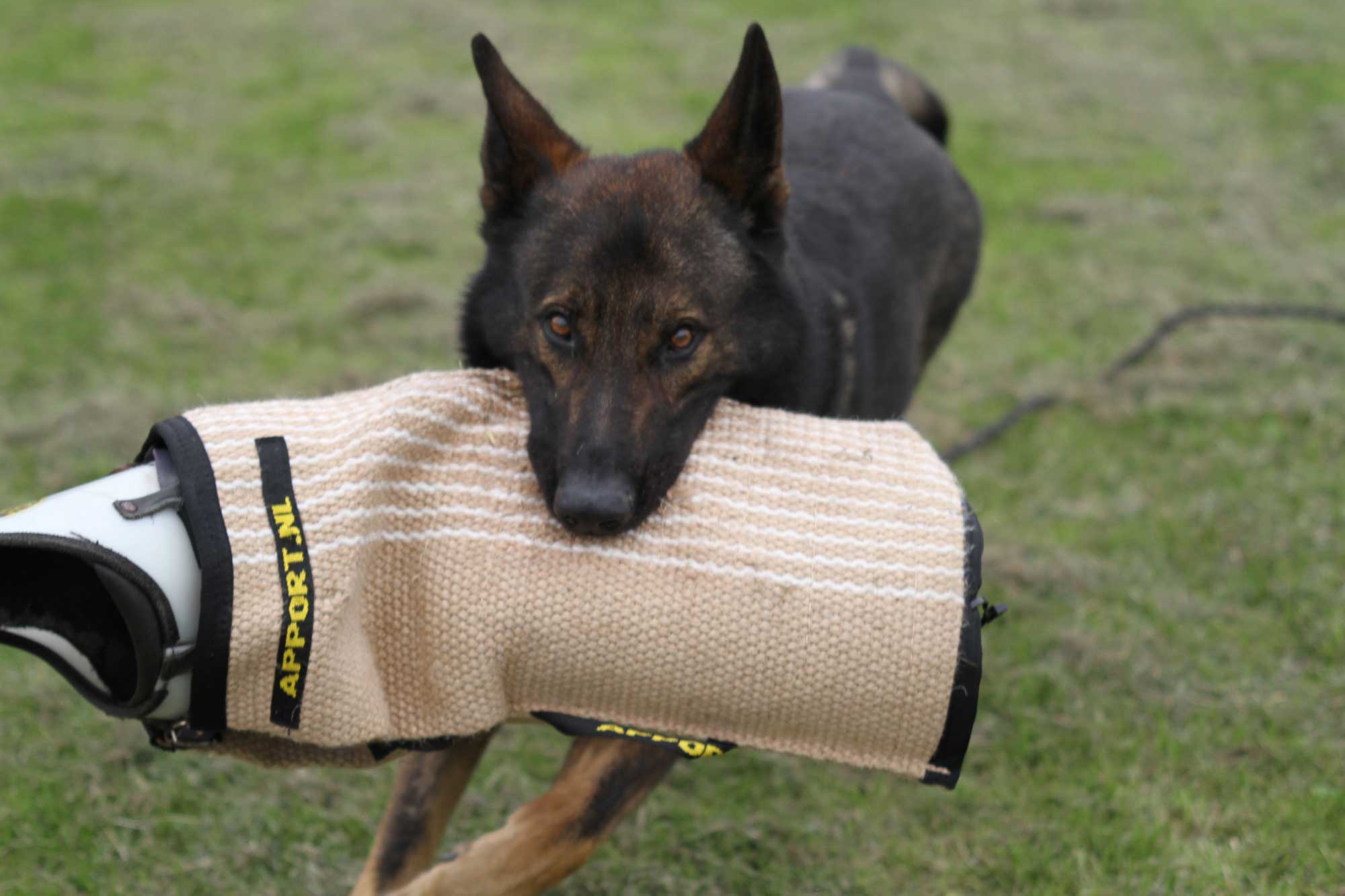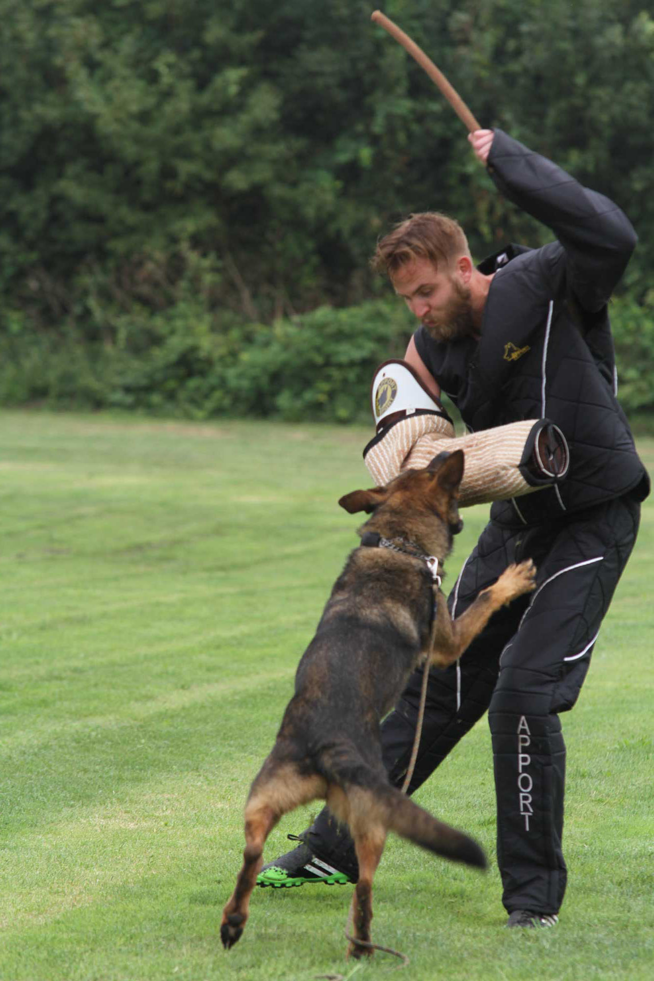 Bij het manwerk is de rode draad, dat de hond op commando de pakwerker zelfstandig staande houdt. Zo moet de hond tot maximaal 6 ‘verstekken’ (schuttingen) inspecteren, waar de pakwerker, zonder gezien te worden, zich kan verstoppen voor de hond. Als de hond de pakwerker gevonden heeft, moet hij, zonder deze aan te raken, beletten dat deze kan vluchten.