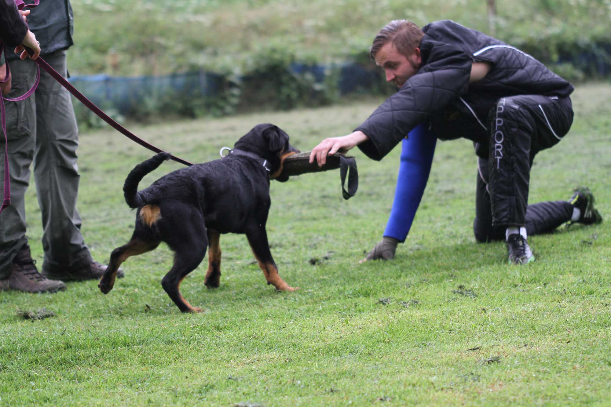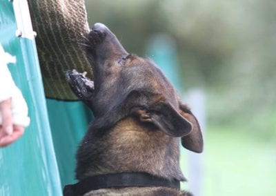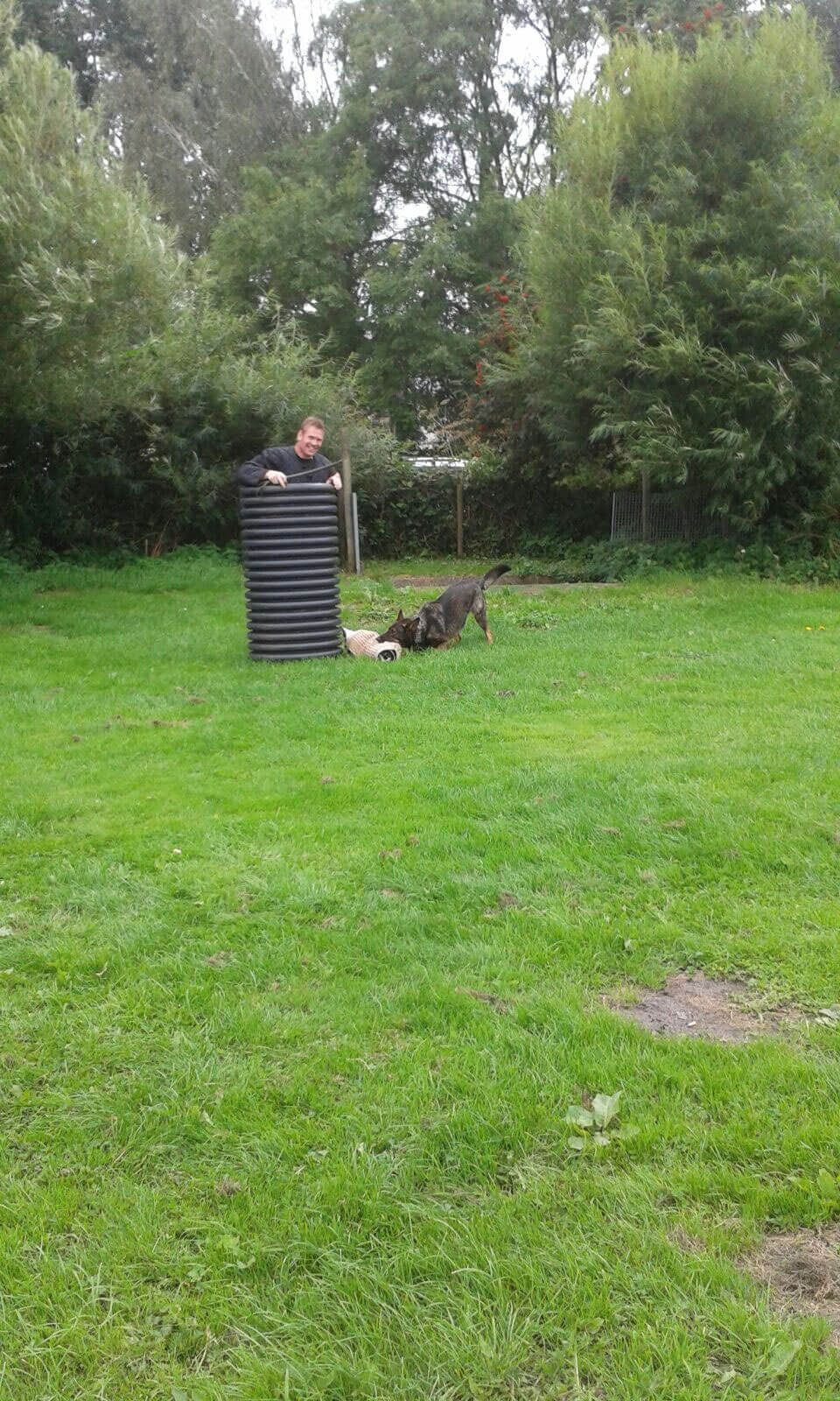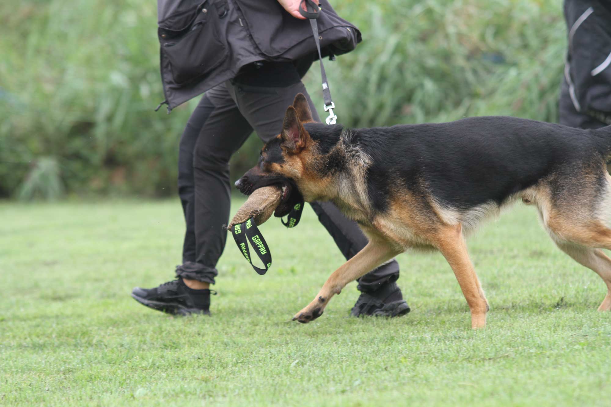 Bij het manwerk is de rode draad, dat de hond op commando de pakwerker zelfstandig staande houdt. Zo moet de hond tot maximaal 6 ‘verstekken’ (schuttingen) inspecteren, waar de pakwerker, zonder gezien te worden, zich kan verstoppen voor de hond. Als de hond de pakwerker gevonden heeft, moet hij, zonder deze aan te raken, beletten dat deze kan vluchten.